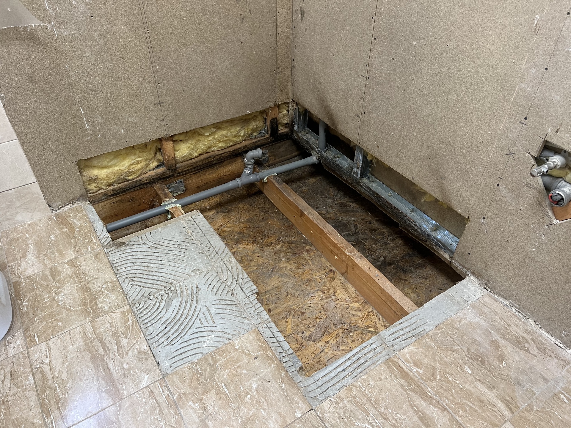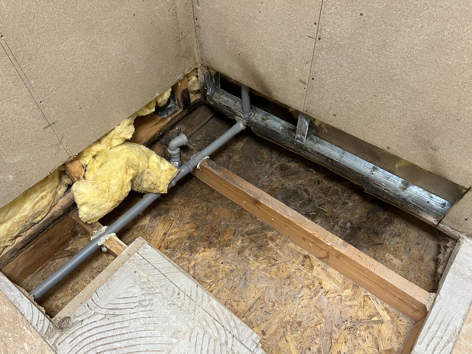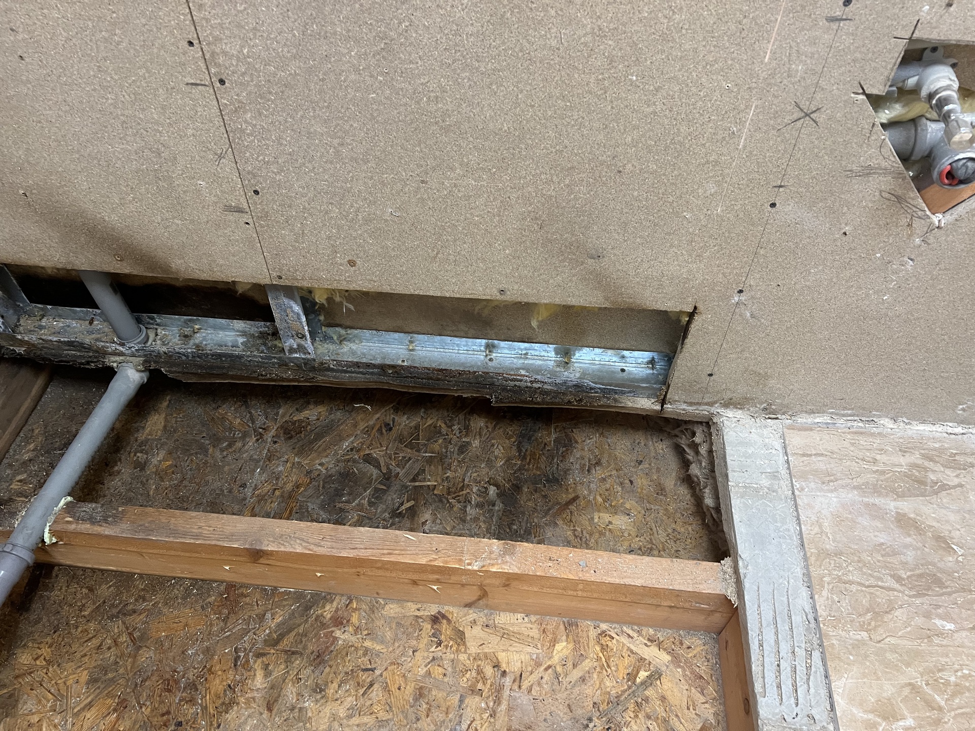 Současně bylo zjištěno, že již při výrobě došlo k zásahu do nosné části podlahy, aby bylo možné vést kanalizační potrubí. Tento zásah negativně ovlivnil konstrukční řešení a pravděpodobně přispěl ke vzniku problému.
